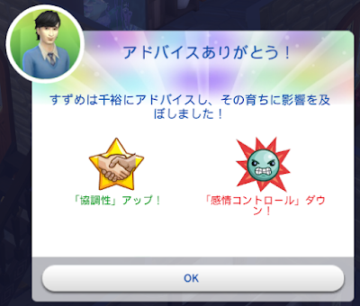 子育てスキルが上がったことで、答えを選んだ時に上がる育ちが表示されるようになりました。下がるメーターについてはまだ表示されていませんが、プラスのものが表示されるようになっただけでも大きい。